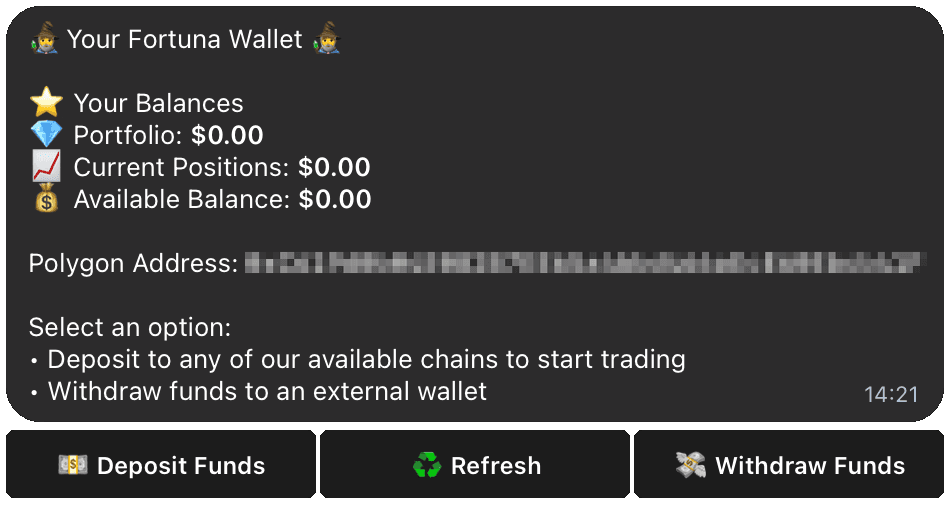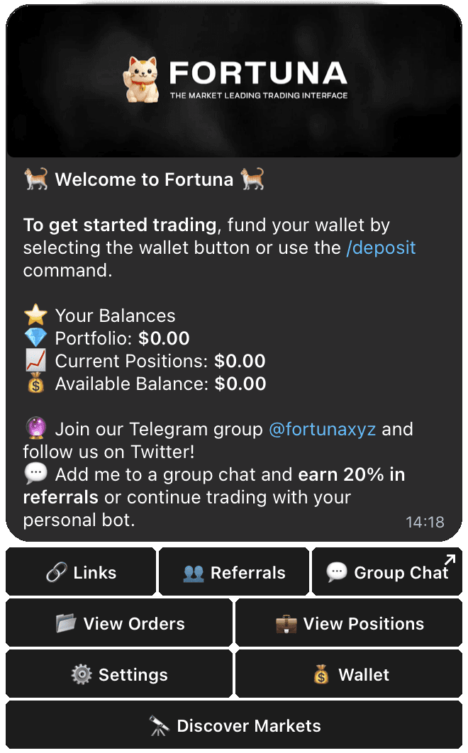/search or /s— Search for a specific tradable market using a query./markets— Browse Polymarket markets inside the bot or paste a Polymarket link to trade instantly./wallet— Check your wallet address, tradable balance, and initiate withdrawals./positions— View your open position balances. You cannot call this command on another user./orders— Manage your open limit orders. Cancel or monitor pending executions./referrals— Track the overall performance history of calls in your chat/deposit— Deposit funds to your wallet./withdraw— Withdraw funds from your wallet./add— Add Fortuna to any group chat.