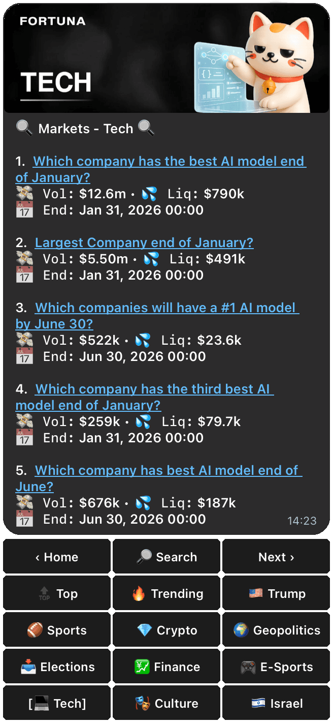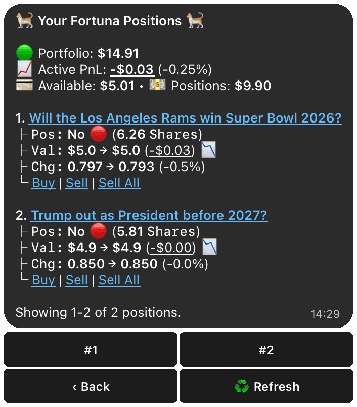 Fortuna is your ultimate tool for trading on Polymarket. Providing real time market analysis, insights, and charting visualizations, with simple commands. Buy, sell & manage your portfolio with rapid speed and superior execution, all within Telegram.